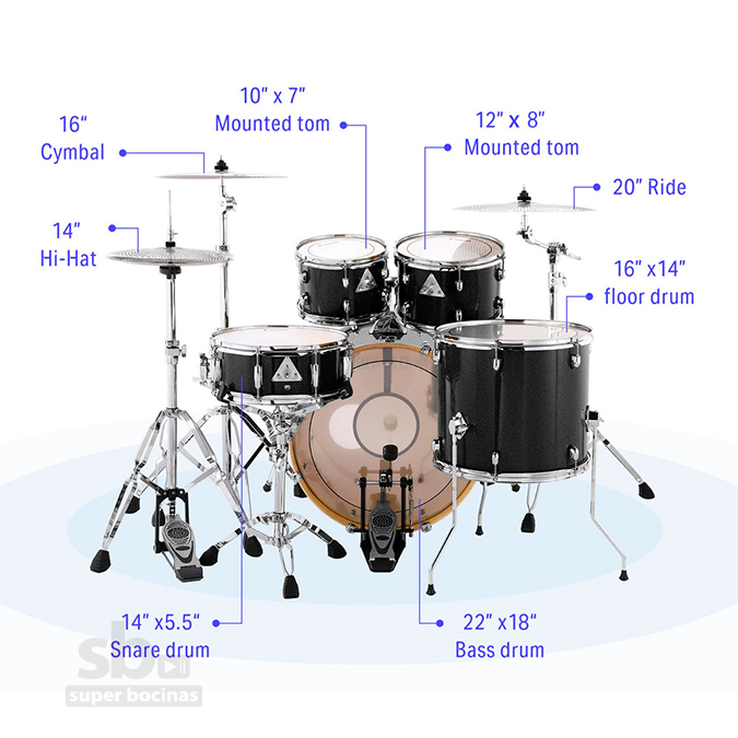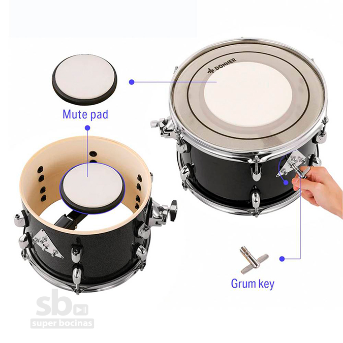 Este kit incorpora pads de práctica silenciosos, lo que permite reducir el ruido durante los ensayos, ideal para practicar en casa. Además, incluye todos los herrajes y platillos necesarios, por lo que el baterista puede comenzar a tocar inmediatamente sin comprar accesorios adicionales.