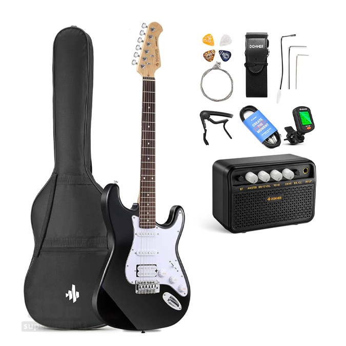 Este paquete de guitarra eléctrica Donner DST-100 incluye todos los accesorios que necesitas para empezar a tocar desde el principio. El paquete incluye guitarra eléctrica Donner DST-100, amplificador MINI de 3W, bolsa de concierto de buena calidad, capo de guitarra, afinador, cuerdas, correa y púas. ¡Ahórrate tiempo y dinero con un paquete de guitarra eléctrica todo en uno! Disfruta de tu propia vida divertida y colorida.